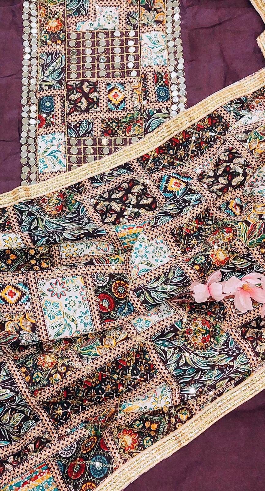 Top (Kurti): Premium cotton in wine color with traditional Gujarati mirror work & embroidery