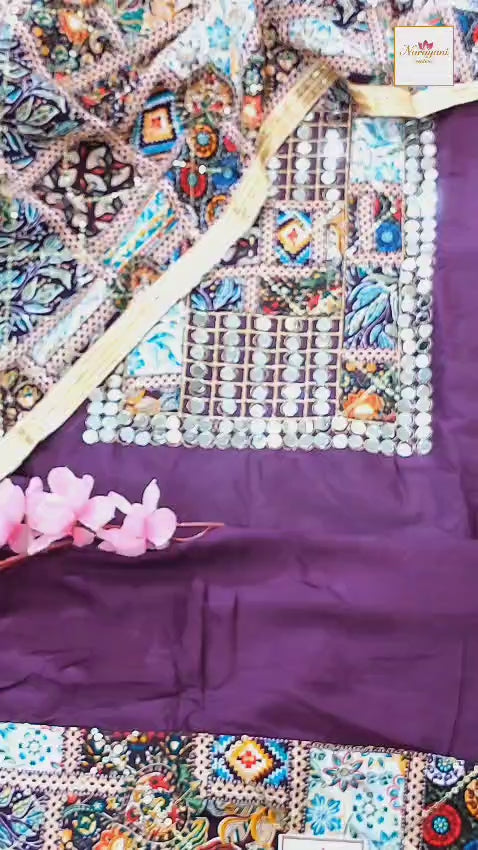 Unstitched wine Gujarati cotton suit with mirror work & embroidery. A perfect ethnic outfit for festive occasions, weddings & elegant everyday wear.