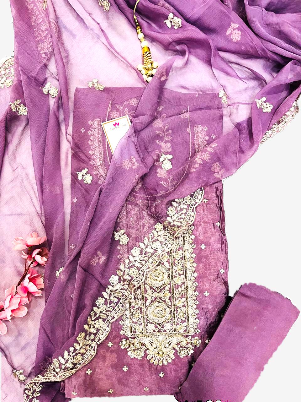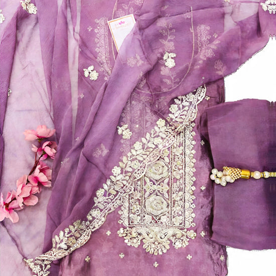 Make a breathtaking impression this festive season with our show-stopping Modal unstiched suit in enchanting lavender hue. Delicate, intricate embroidery dances across the kurti and dupatta, radiating elegance and sophistication. Paired with a comfortable Rayon bottom, this stunning ensemble is tailor-made for Indian festivals, weddings, and unforgettable special occasions.