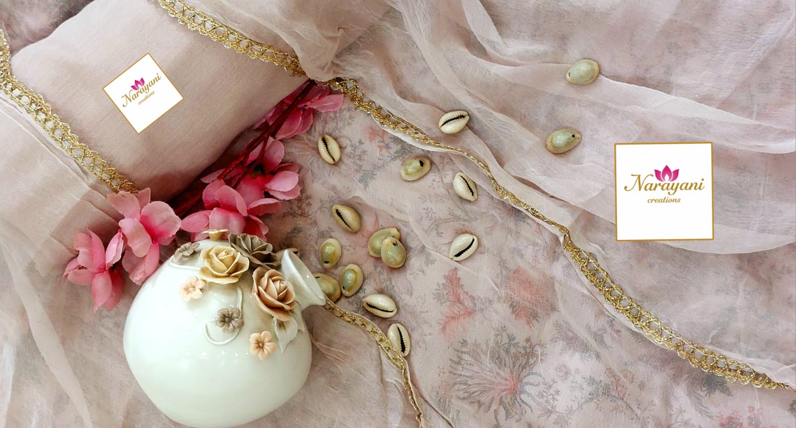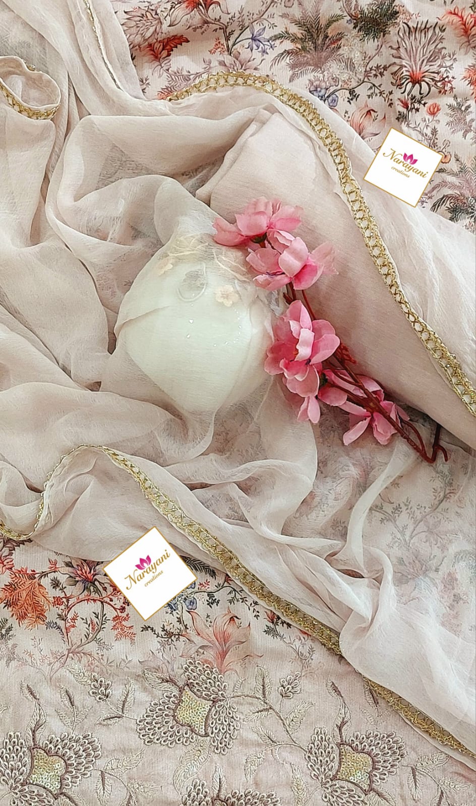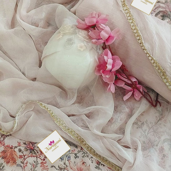Soft pink nude Rayon suit with floral charm & golden lace dupatta – a smart casual essential for graceful everyday elegance.