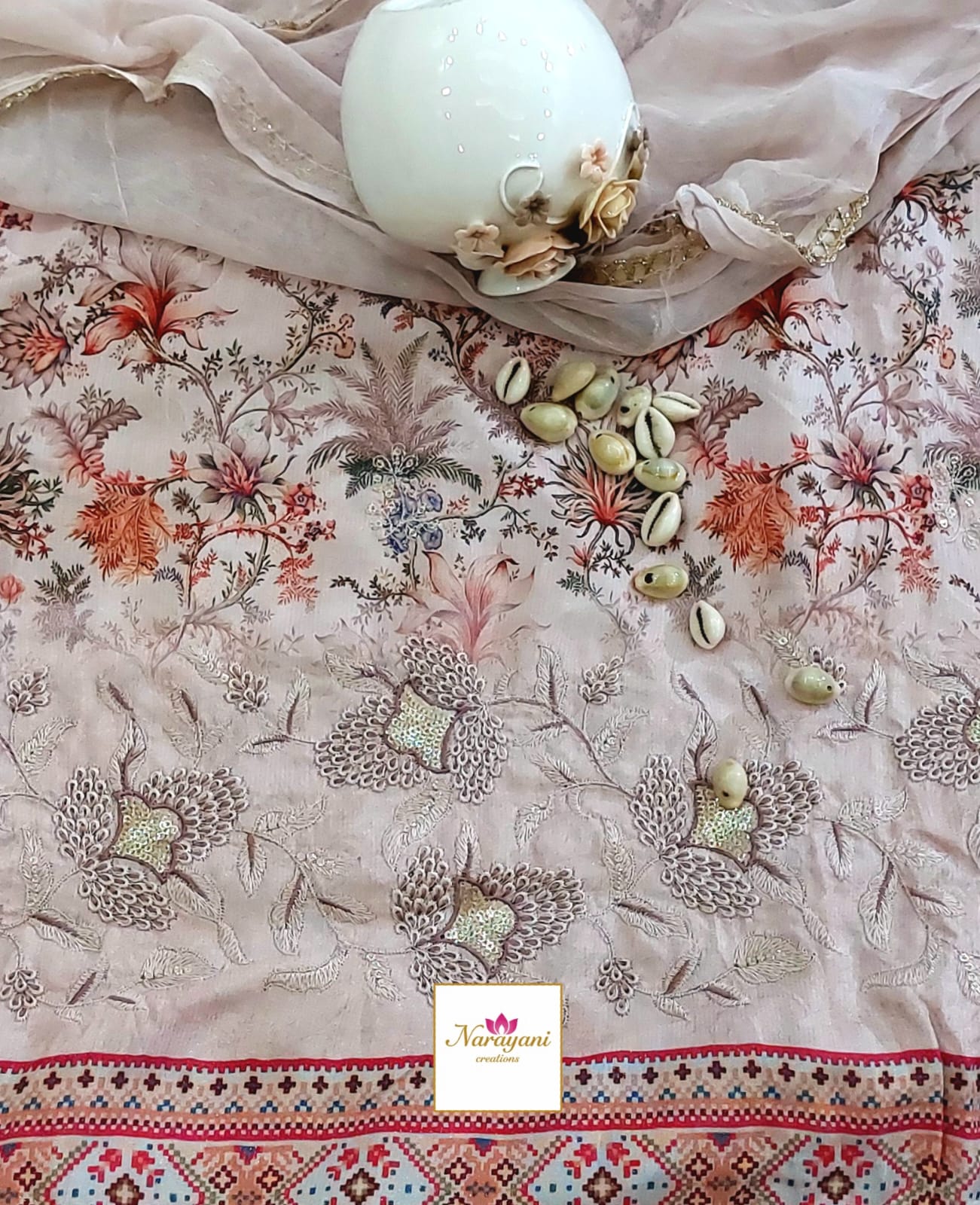 Top (Kurti): Soft pink nude Rayon with floral print & embroidery border