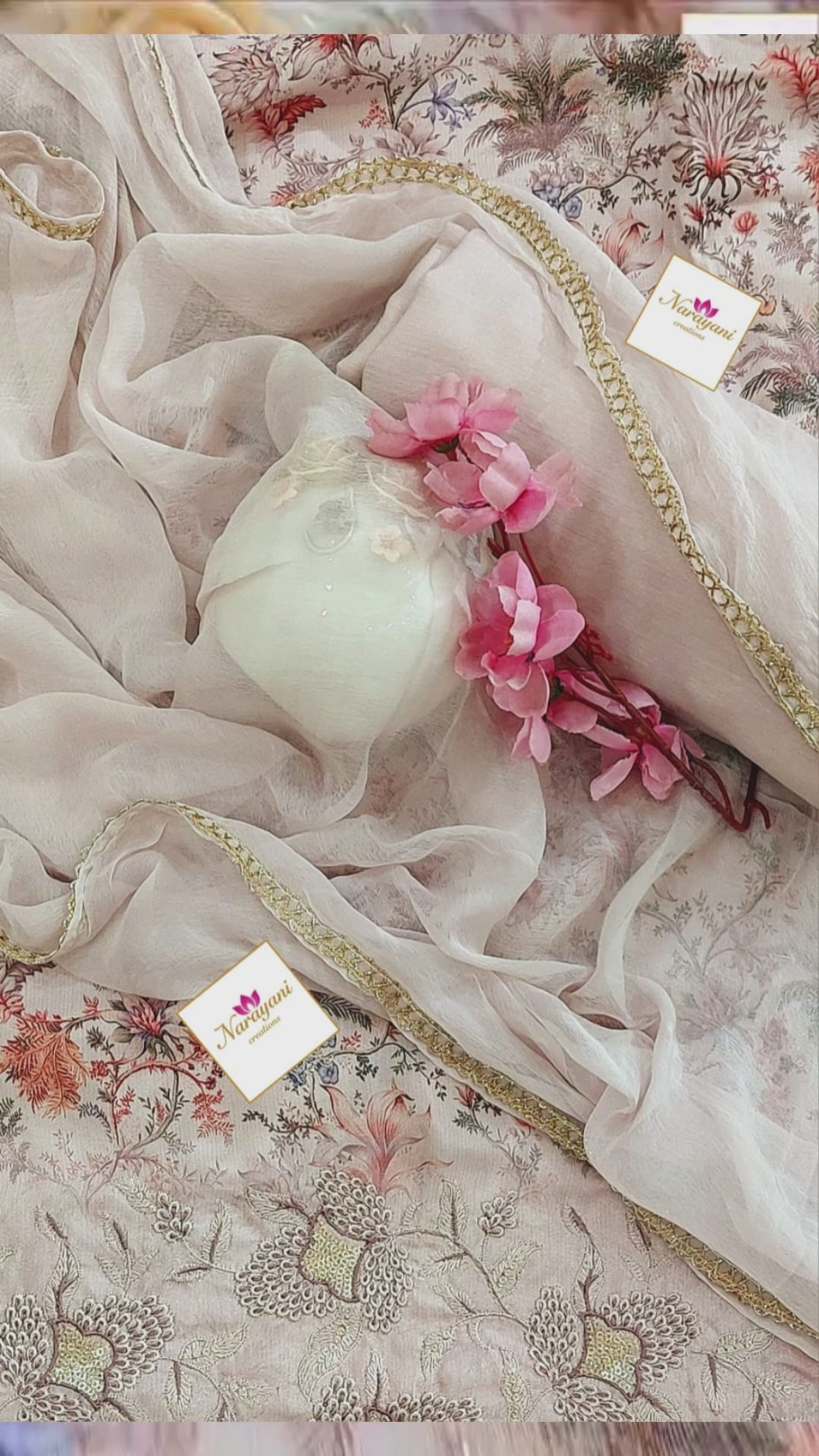 This exquisite Rayon suit set in a soft pink nude hue is designed for timeless elegance. The kurti features delicate floral prints with fine embroidery along the border, paired with a matching plain rayon bottom for a refined look. A lightweight chiffon dupatta with luxurious golden lace edging completes the set. Perfect for smart casuals, festive occasions, or everyday ethnic wear, this kurti set blends comfort, style, and sophistication.